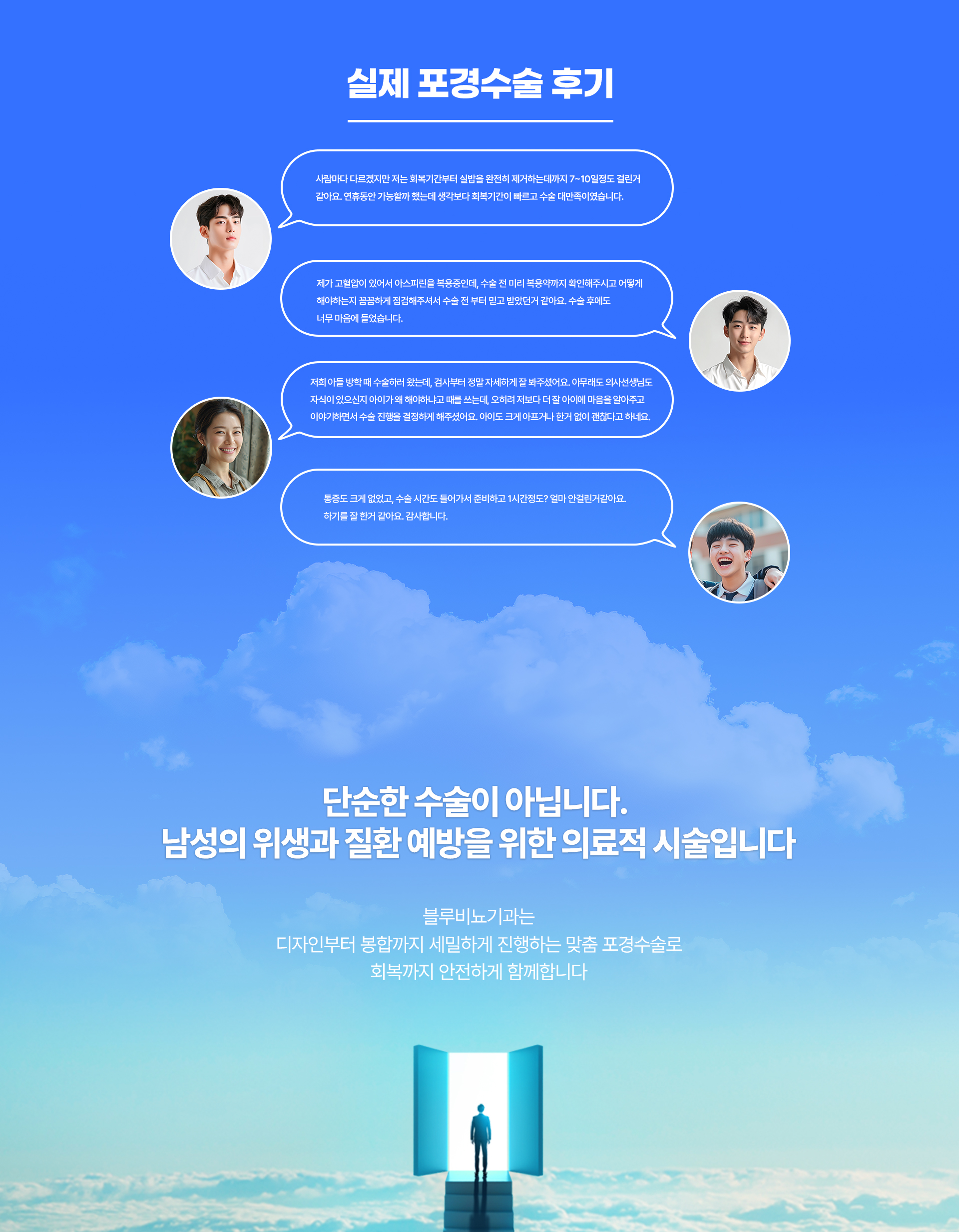 블루 더블업 포경수술은 슬리브 포경수술 방식을 이용하여 수술을 진행한 뒤 남은 속살을 제거하지 않고 귀두 뒤편으로 두툼하게 말아 음경의 볼륨감을 올려주어 확대 효과를 얻을 수 있는 방법입니다.