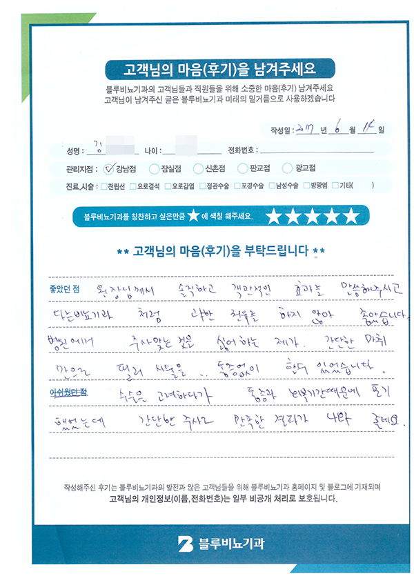 수술을 고려하다가 통증과 외부기간때문에 포기 했었는데 간단한 주사로 만족한 결과가 나와 좋네요.