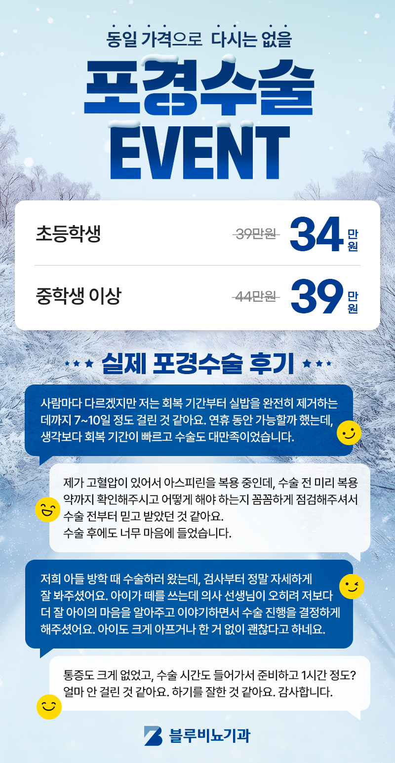 안녕하세요! 믿음과 신뢰의 블루비뇨기과 입니다 :) 올 한해도 고생 많으셨습니다. 26년도를 맞이해서 포경수술 EVENT를 진행합니다!